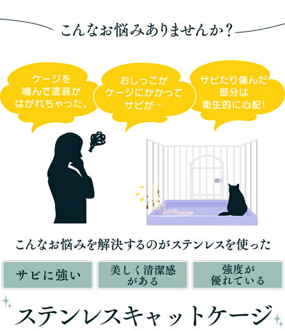 ■商品サイズ(cm)本体:幅約93×奥行約63×高さ約121(キャスター含む)中間トレー:幅約52×奥行約45【入口】大:幅約52×高さ約41小:幅約35×高さ約40■重量(kg)約11.78■耐荷重量(kg)中間トレー:約8■材質線材:ステンレストレー・キャスター:ポリプロピレンジョイントパーツ部:ポリプロピレン、ABS樹脂バックル:ABS樹脂キャスターストッパー:ポリエチレン高級感があり、丈夫で錆びにくいステンレスのペットケージです♪